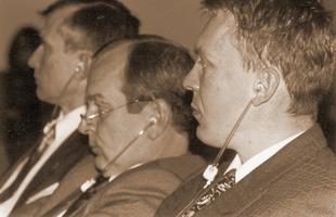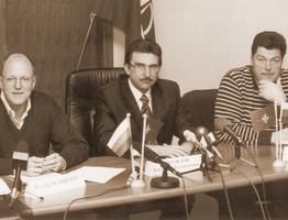 Рольф Вельбертс, Евгений Михайлов и Михаил Маргелов в ожидании вопросов журналистов.