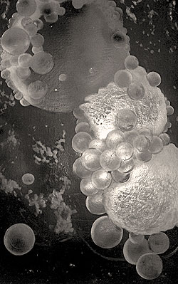 Глазам зрителей предстали яркие флюорисцирующие полотна на стенах, ярко-красные и ярко-зеленые узоры которых представляли собой, как уверяют специалисты, “микроскопические срезы того, что происходит внутри нас”. Сюжеты картин, подготовленных, кстати, для выставки в петербургском музее Фрейда, живо напоминали иллюстрации из учебника биологии (коими, как выяснилось, авторы и вдохновлялись).