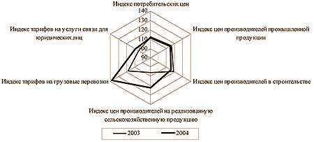 В 2004 году значительно выше, чем в предыдущем году выросли тарифы на грузовые перевозки автомобильным транспортом и в производстве сельскохозяйственной продукции. Рост цен производителей в строительстве и в промышленности был также выше роста цен на потребительском рынке.