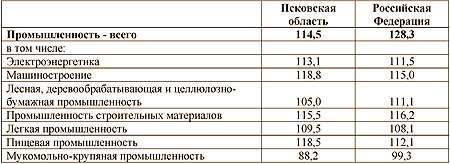 Рост цен производителей промышленной продукции по Псковской области в 2004 году был значительно ниже, чем в целом по Российской Федерации, но в некоторых отраслях опережал рост цен в среднем по РФ - в электроэнергетике, машиностроении, легкой и пищевой промышленности: