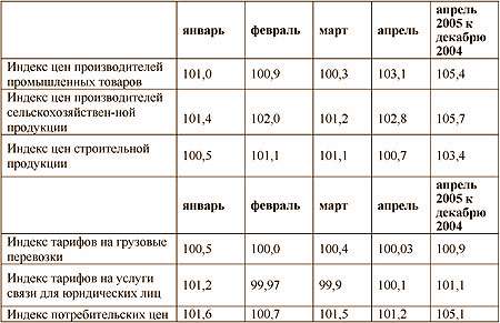 В январе-апреле 2005 г. более всего выросли цены на реализованную сельскохозяйственную продукцию, а также цены производителей в промышленности, которые несколько превысили рост цен на потребительском рынке.