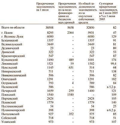 За июнь суммарная просроченная задолженность по заработной плате увеличилась в 10 районах области и г. Великие Луки (за май 2005 года – в 17 районах области, гг. Пскове и Великие Луки). Наибольшее снижение задолженности по заработной плате наблюдается в Пустошкинском районе (на 75%). Наибольшее увеличение задолженности (в 6,2 раза) отмечено в Пушкиногорском районе. Задолженность из-за недофинансирования из федерального бюджета осталась в Островском районе и г. Пскове, из областного бюджета – в г. Пскове и 3 районах области из местных бюджетов – в г. Пскове и 5 районах области.