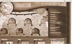 За короткий период ознакомления с ресурсом вопросов к его техническим характеристикам не возникло [ 1 ]. Все грузится, навигация удобна, с каждой страницы можно перейти в любой другой раздел сайта. Информация хорошо структурирована, хотя раздел «культура» на сайте про культуру заставил меня улыбнуться. Впечатляет интерактивная карта Псковской области – кликаешь на район, и попадаешь на его страничку. Такая же карта сделана по памятникам города Пскова.