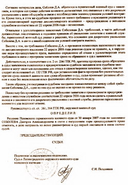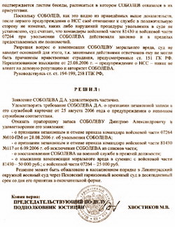 Впечатляет сама преамбула принятого судебного решения: «Псковский гарнизонный военный суд в лице председательствующего: судьи — подполковника юстиции Хвостикова М. В., при секретаре - Шабановой Е. Ю., с участием заявителя - Соболева Дмитрия Александровича (выделено мной – Авт.), командира войсковой части 81430 Дударенко В. М., представителей войсковой части 81430 и войсковой части 07624 майора Никонова И. Н. и подполковника Баулина И. Е., а также заместителя военного прокурора Псковского гарнизона подполковника юстиции Дубянского О. В., рассмотрев в открытом судебном заседании в помещении суда заявление Соболева Д. А. о признании незаконными приказов командиров войсковых частей 81430 и 07264 об увольнении Соболева с военной службы, наложении на него дисциплинарных взысканий и компенсации морального вреда установил…»