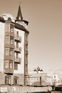И, наконец, тот самый «жилой дом и офисный центр» на площади Героев-десантников в г. Пскове. Заказчик – ЗАО «Реставрационная мастерская», автор проекта – архитектор Эдуард Ким.