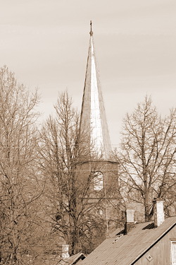 | Шпиль печорской кирхи хорошо виден с дороги, ведущей из Пскова к монастырю. Фото: Михаил Глущенко |