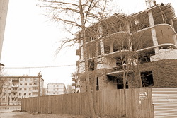 | Новый дом еще не дотянулся до уровня своего соседа – 7-этажного здания ДСК, но должен дотянуться и «переплюнуть» его на десять с лишним метров. Фото: Лев Шлосберг |