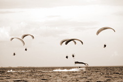 | В небе – солнце и облака, под ними – разноцветные крылья парамоторов. Фото: Александр Сидоренко |