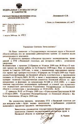 Причиной лишения премии, по словам г-жи Лемешевой, стало невыполнение ею предписаний Роспотребнадзора и Росздравнадзора, направленных в адрес начальника госпиталя. «При этом, в нарушение ст. 22 ТК РФ, с предписаниями Роспотребнадзора № 309 от 03.03.09 и Росздравнадзора № 23 от 20.03.09 я вообще не была ознакомлена, - говорит Светлана. - Более того, каких-либо распоряжений о выполнении данных предписаний от начальника госпиталя я не получала, и, соответственно, не могла их исполнять. А 31.03.09 я вообще была уволена с нарушением норм ТК РФ, восстановлена на работе определением суда и приступила к исполнению своих обязанностей только 11.06.09. С данными предписаниями я была ознакомлена постфактум 14.07.09, при этом сроки их выполнения были определены до 20.04.09.», - с таким заявлением г-жа Лемешева обратилась за помощью в государственную инспекцию труда Псковской области.