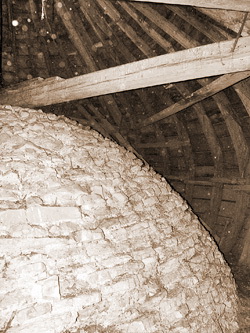После сведения своды и арки покрывались сверху тщательно затертой стяжкой из цемяночного раствора. Барабан опирается на систему пониженных подпружных арок [ 23 ], опирающихся, в свою очередь, на консоли [ 24 ] с полочками (импосты [ 25 ]) и паруса [ 26 ], облегченные заложенными в каменную кладку глиняными горшками. Паруса отделяются от барабана выступающей полкой, образующей кольцо.