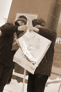 Тем не менее, было очевидно, что региональные власти с некоторой нервозностью ждали, как именно развернутся события. Площадь Ленина, на которой по традиции собрались коммунисты, была обильно усеяна отчаянно мерзнувшими сотрудниками милиции, а неподалеку припарковался «засадный полк» - автобус с ОМОНом.