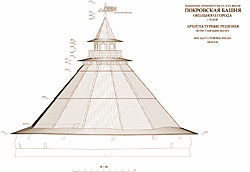 | Архитектурное решение реставрации шатра Покровской башни. Фасад со стороны входа. Апрель 2010 года. Псковский филиал ФГУП «Институт «Спецпроектреставрация». |