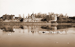 Мы уже привыкли, к тому, что есть в Пскове старая руина – Покровская башня – грузная, одиноко подпирающая берег, заваленный цветной шелухой пивных шалманов и сопутствующих им отходов. Историческая (даже недавняя) память горожан заблокирована от воспоминаний, взгляд легко скользит туда-сюда и невольно отводится на фасадец ширмы-многоэтажки, загрузившей почти всё пространство площади Героев-десантников [ 2 ].