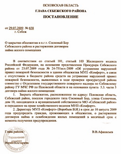 «В соответствии со статьей 101 [ 6 ], статьей 103 [ 7 ] Жилищного кодекса РФ, на основании представления прокурора Себежского района… «Об устранении нарушений правил пожарной безопасности в здании общежития МУП «Комфорт», в связи с отсутствием в бюджете района средств на устранение нарушений правил пожарной безопасности, выявленных в ходе проверки прокуратурой района совместно с Отделением государственного пожарного надзора по Себежскому району ГУ МЧС РФ по Псковской области и на основании пункта 5.3. части 5 договора найма жилого помещения: