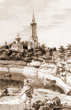 | Вид на Снетогорский монастырь. Рисунок С. И. Иванова, 1837 г. Фрагмент. |