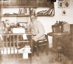 | Лев Толстой в рабочем кабинете в Ясной Поляне. Фотография. |