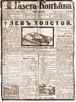 Взглядов, как всегда в России, два. Можно увидеть всегдашнее толкучее любопытство прессы, выслеживающей каждое движение Софьи Андреевны и родных (завтра на первую полосу «Коммерсанта» или «Комсомолки»), беспокойное снование фото- и кино- корреспондентов, ищущих эффектного кадра (в утренний выпуск Ren, НТВ СТС), усталые лица телеграфистов, отправивших из Астапова за дни болезни Льва Николаевича тысячу с лишним телеграмм и торопивших время, чтобы все закончилось. А можно и нужно увидеть более дорогое – как даже и в суетной и усталой душе в час смерти Толстого совершалась высокая преображающая работа, и смерть его становилась последним уроком русскому сердцу.