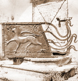 | Полотнище прапора Власьевской башни. Лицевая сторона 2: Барс побеждающий. Автор В. П. Смирнов. Фото М. И. Семенова, 1966 г. |