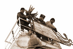 | Установка прапора над Власьевской башней. Кузнецы Павел Шаповалов (справа), Андрей Степанов (слева), сотрудник МЧС Анатолий Селиванов (в центре). Фото: Лев Шлосберг |