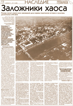 2 См.: С. Прокопьева. Позолоченная набережная // «ПГ», № 42 (113) от 31 октября – 6 ноября 2002 г.; С. Прокопьева. Золотые раскопки // «ПГ», № 34 (155) от 10-16 сентября 2003 г.; С. Прокопьева. «Вы должны были отправляться на войну за свои памятники» // «ПГ», № 20 (190) от 2-8 июня 2004 г.; С. Прокопьева. Погребенные ценности // «ПГ», № 13 (232) от 6-12 апреля 2005 г.; С. Прокопьева. Кремль за побрякушки // «ПГ», № 13 (232) от 6-12 апреля 2005 г.