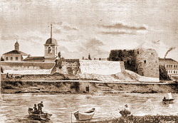 | Вид набережной реки Великой у Покровской башни от Мирожского монастыря. Рисунок губернского архитектора Александра Николаевича Векшинского (1859-1908). |