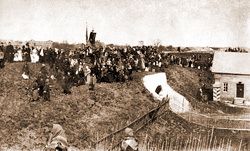 | Западные ворота, вид из крепости. Крестный ход по земляному валу. Фото нач. XX в. |