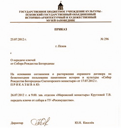 Приказ директора Псковского государственного музея-заповедника о передаче ключей от собора Рождества Богородицы. Подписан 25 июля 2012 года.