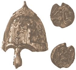 На фото: Шлем князя Ярослава Всеволодовича (отца Александра Невского) и печать (свинцовая) Александра Невского. Из альбома по истории СССР.